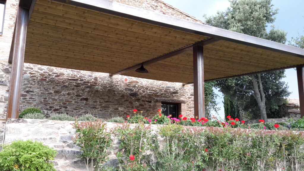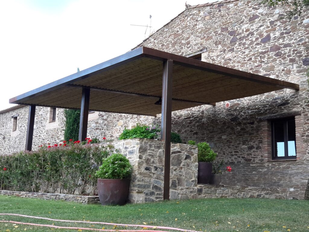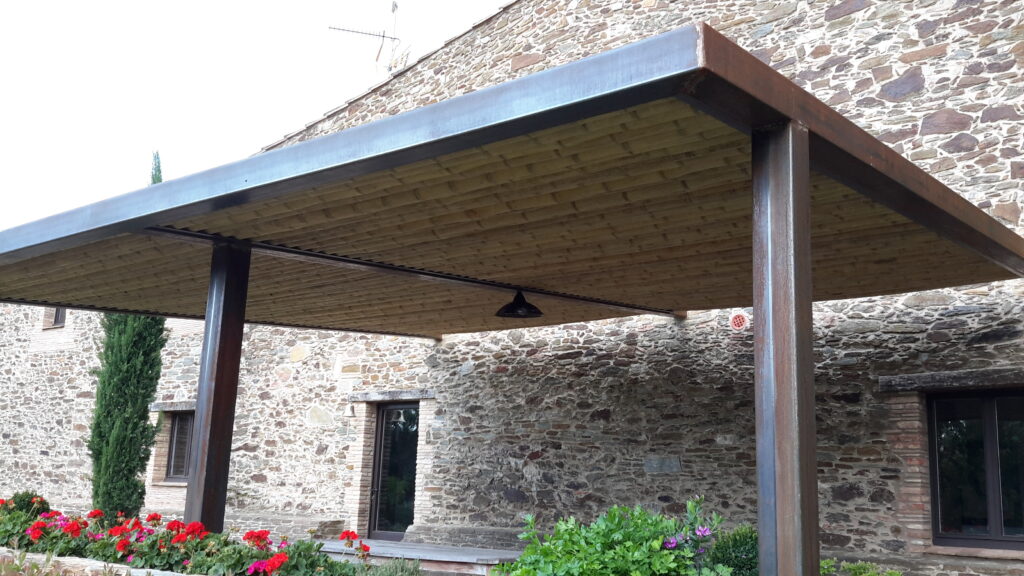 Pérgola de hierro con techo de bambú Guadua natural diseñada para espacios exteriores. La estructura metálica ofrece resistencia y estabilidad, mientras que el bambú aporta un acabado cálido, sostenible y decorativo. Una combinación perfecta entre materiales naturales y modernos que crea sombra y elegancia en jardines, terrazas o zonas de piscina.