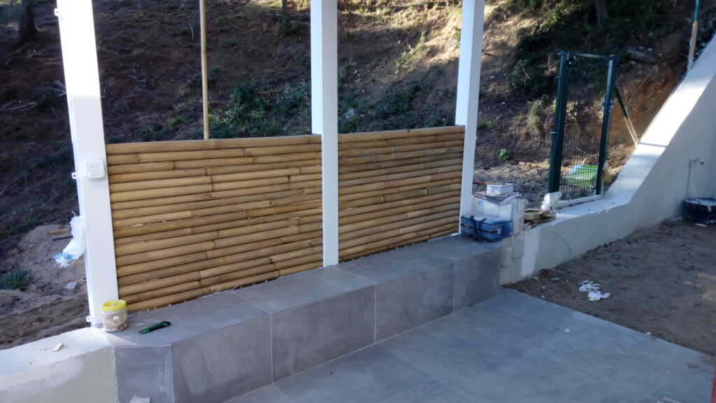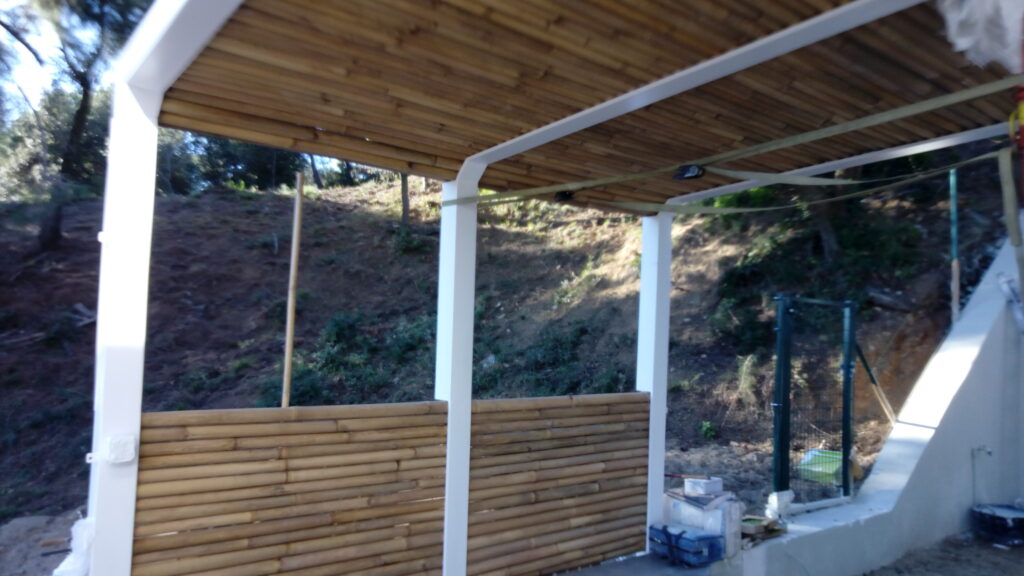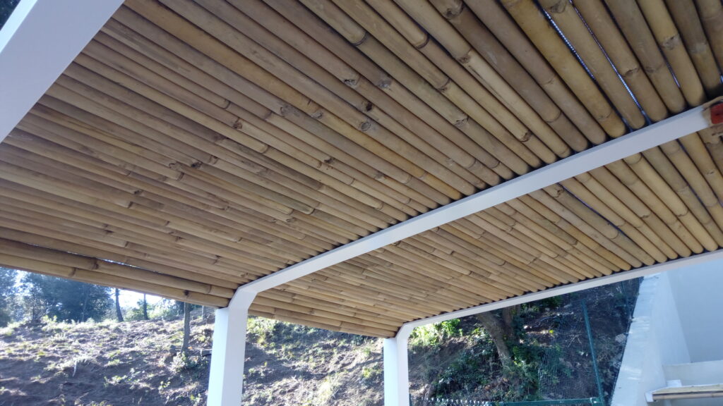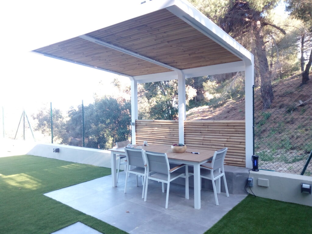 Pérgola con un diseño diferente, tipo marquesina, con iluminacion led integrada en la estructura de hierro en color blanco. Cubierta impermeable de cañas de bambu + policarbonato + caña de bambu en rollo. La pared posterior de la pérgola, tambien se ha hecho con caña de bambú grueso, para aportar privacidad con los vecinos, pero dejando un espacio abierto en la parte superior para conseguir una circulacion de aire que hace la sombra mas agradable en los calurosos dias de verano. Acogedor espacio de barbacoa!!!!